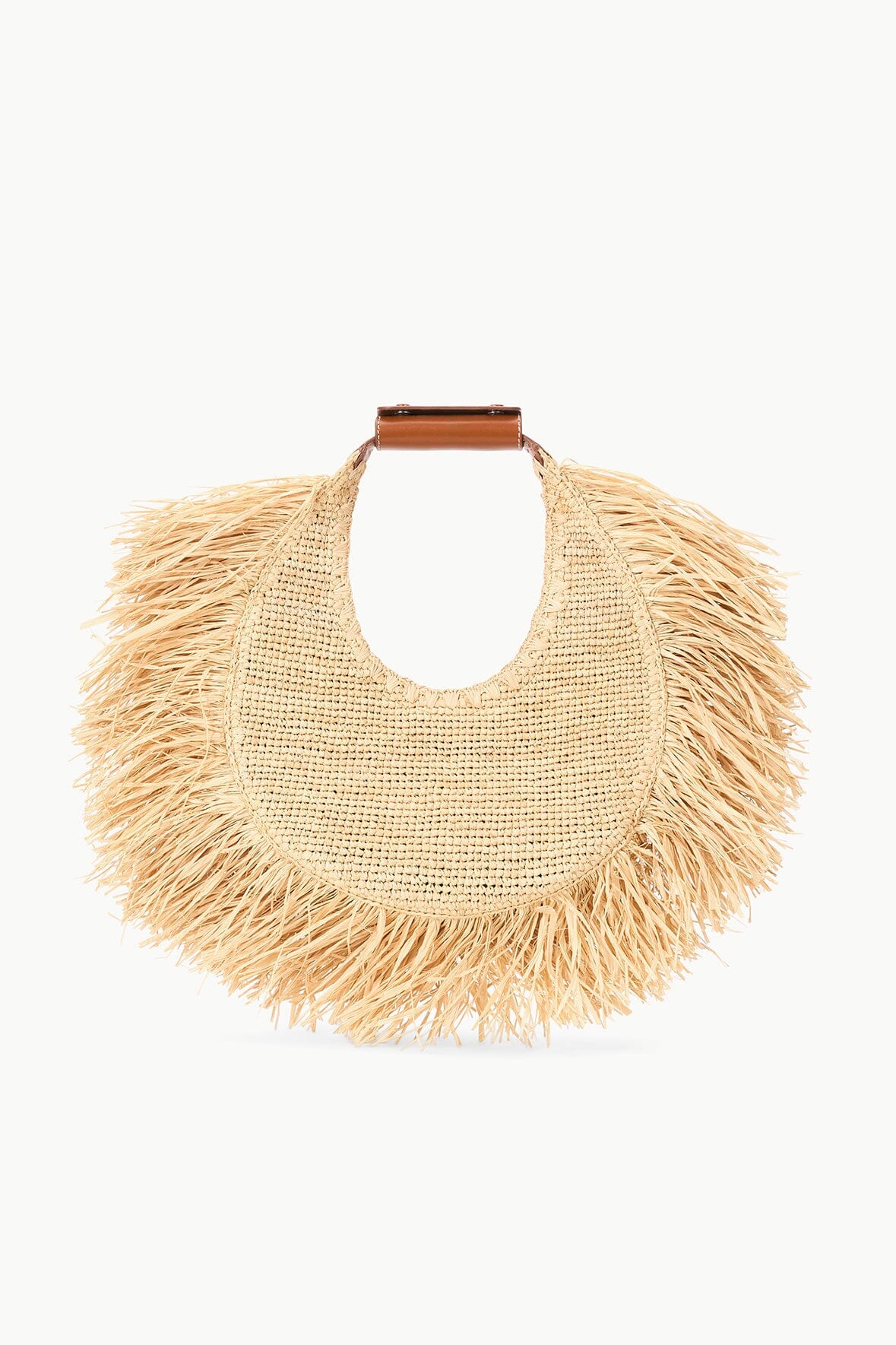 The classic Moon Tote is updated in a seasonal raffia with raffia fringe trim. This style features a removable STAUD-embossed leather handle accent and a magnetic snap closure.