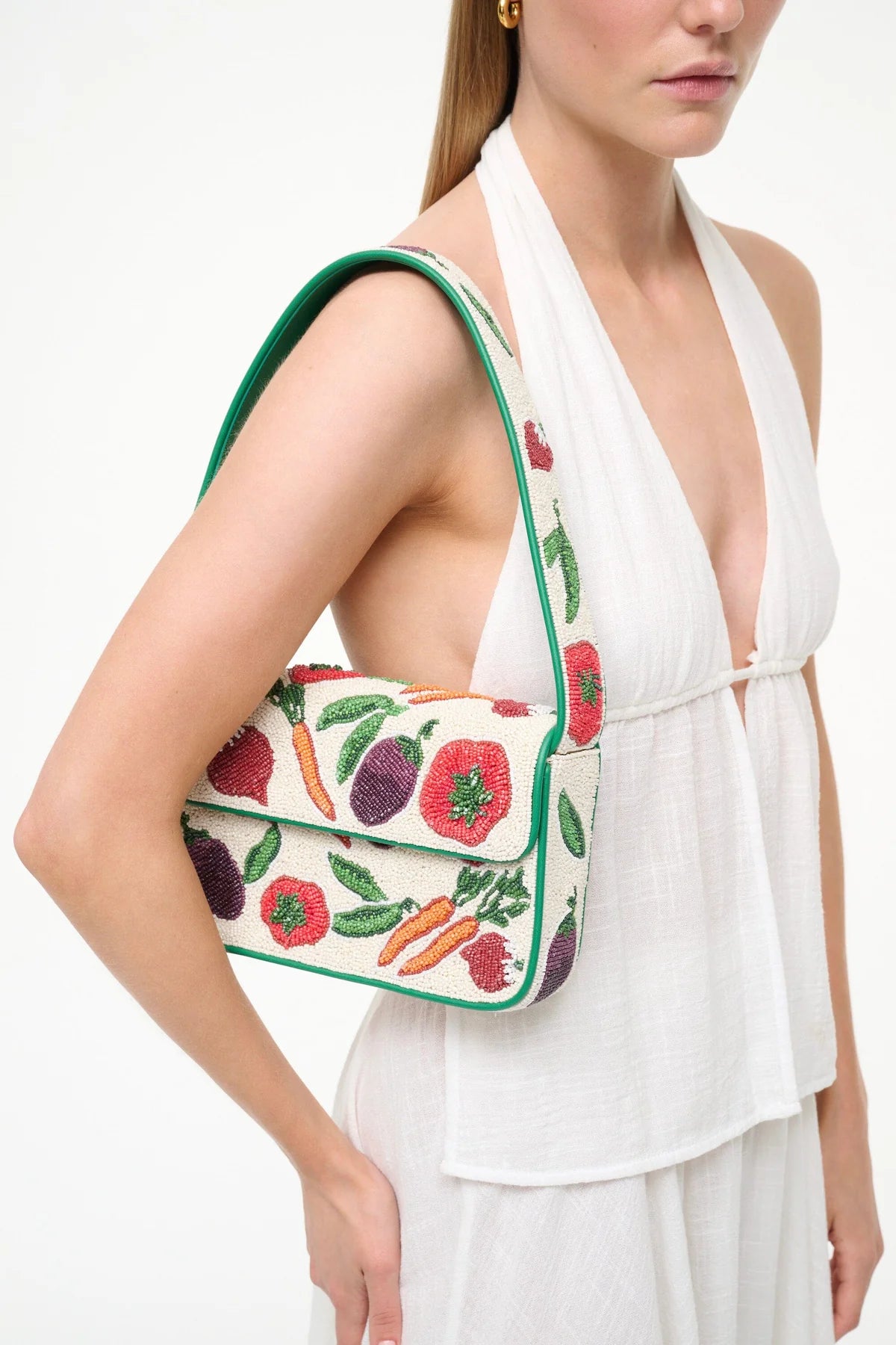 Fresh from the market, the seasonal Tommy bag features a farmers market crudite print. The Tommy Bag is a hand-beaded shoulder bag with vegan leather piping. This style features a single flap closure, inner zip pouch and a pocket on the back.